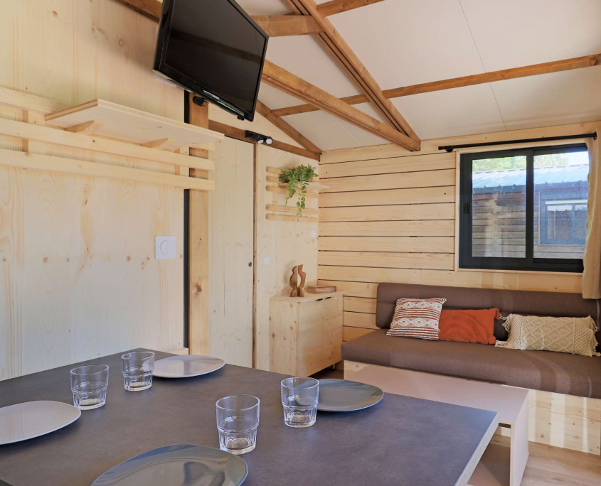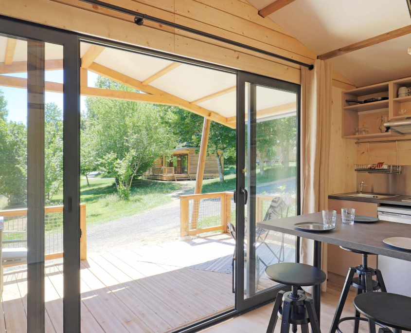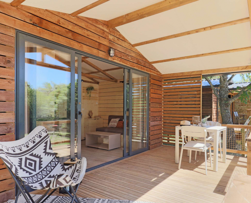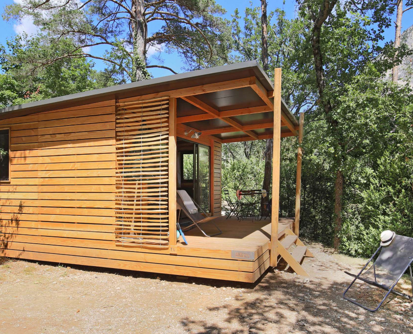 Hébergements haut de gamme avec grande terrasse, ils s’intègrent parfaitement dans le paysage avec leur ambiance bois. Ils sont situés dans un endroit calme du camping à deux pas de tous les services et offrent une vue imprenable sur les gorges.