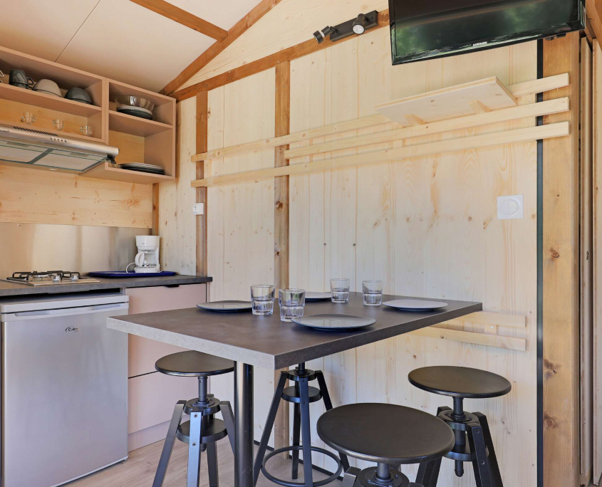 Cuisine équipée d’une plaque gaz 2 feux, réfrigérateur, rangement, pack vaisselle 4 personnes, nécessaire de cuisine, pièce à vivre avec canapé (convertible) et table basse, table 4 personnes pour les repas
