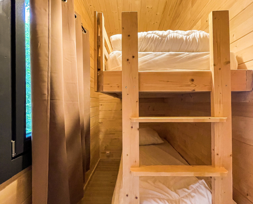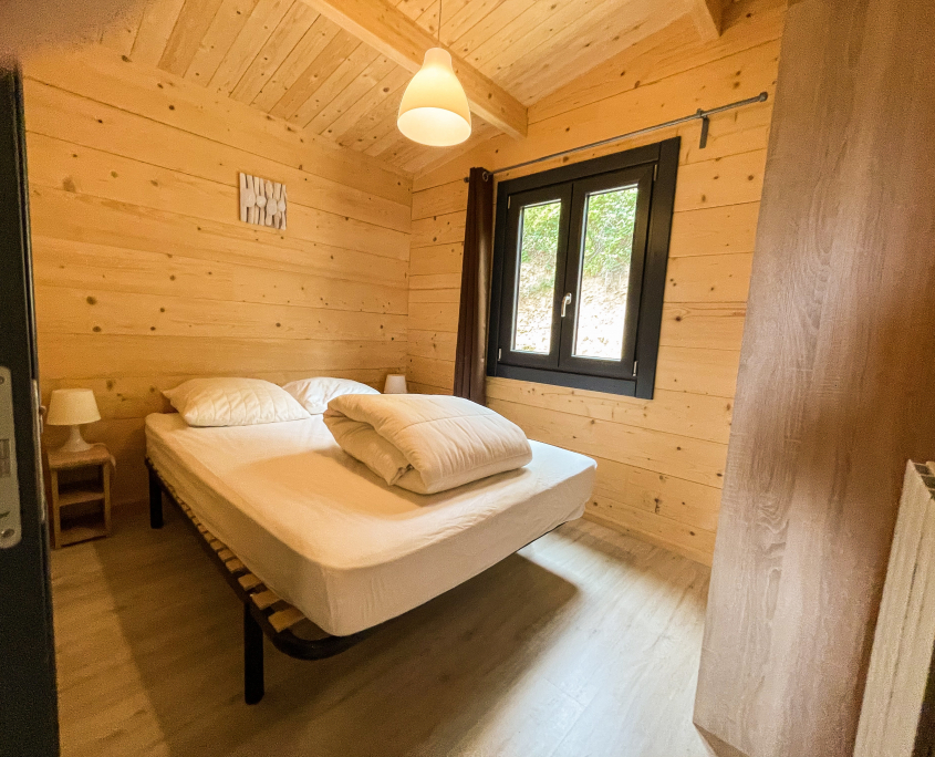 Dans les chalets 3 et 4 :1 chambre double avec lit 140×200, 1 chambre simple avec lits super-posés 80×190