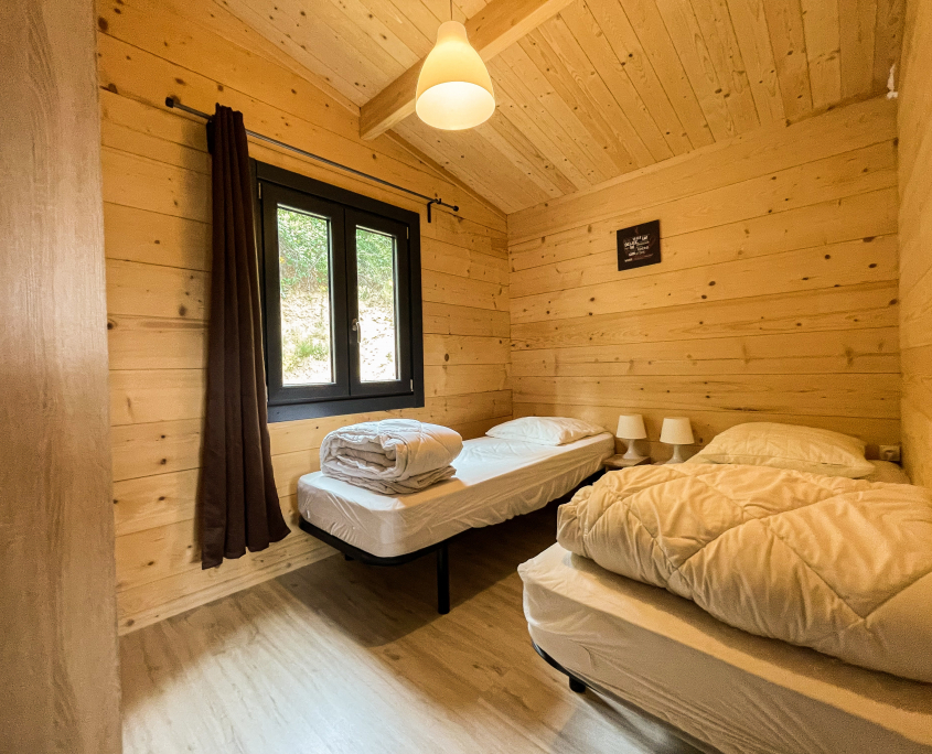 Dans les chalets 1 et 2 :1 chambre double avec lit 140×200, 1 chambre simple avec 2 lits 80×190